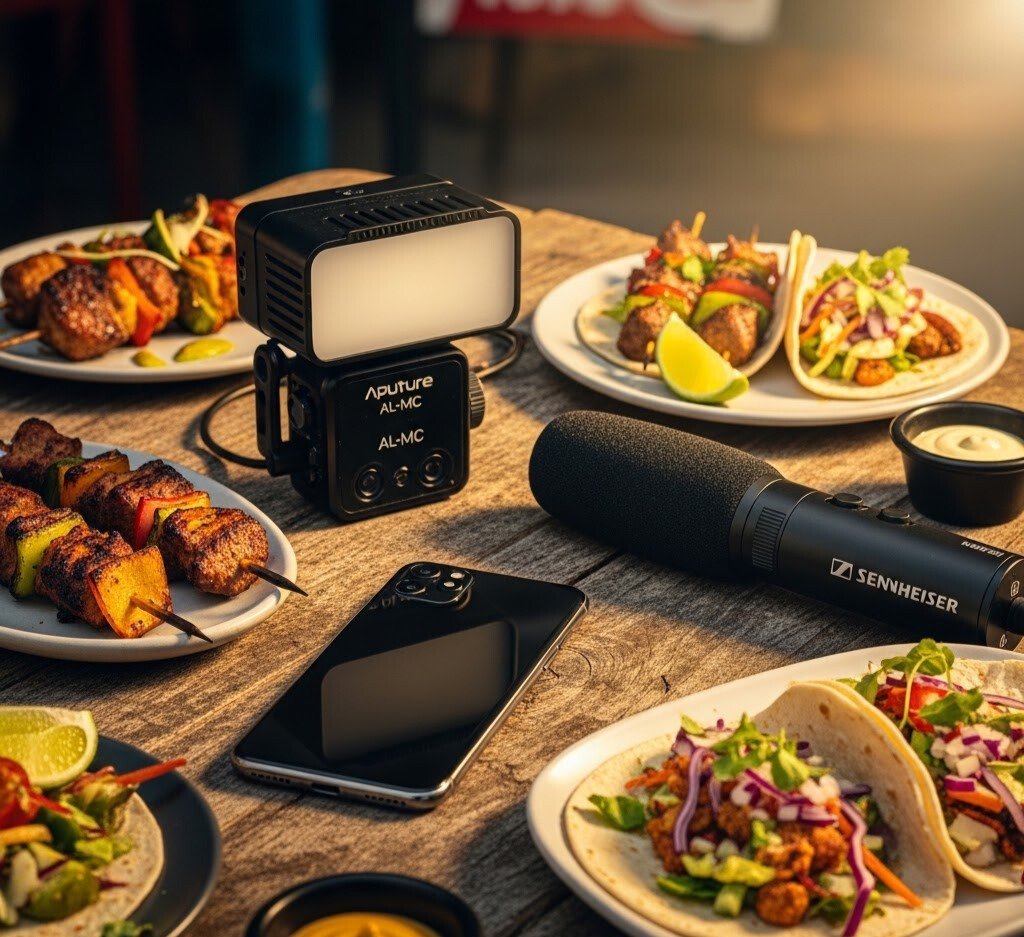 Para convertir el caos de un mercado en un vídeo con estética gourmet, necesitas llevar tu propia luz direccional y un «francotirador» de sonido. Este es el kit minimalista que nunca falta en mi mochila: